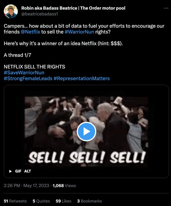 Two hot items today. First, some more data about the valuation of Warrior Nun and why NETFLIX SELL THE RIGHTS matters: